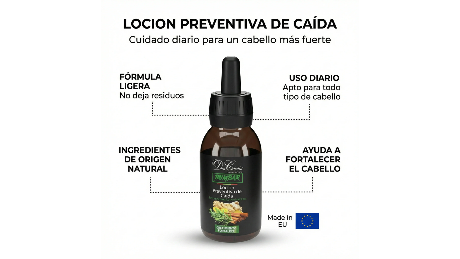 Don Cabello Bombar es una loción capilar eficaz que ayuda a reducir la caída del cabello y fortalecer el cuero cabelludo. Su fórmula ligera permite una fácil absorción sin dejar residuos.