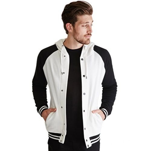 Alanic Clothing is considered a top manufacturing house in the industry and serves as a one-stop shop for anyone seeking stylish varsity jackets. Men's clothing item this is demonstrates a monochrome color block combination that usually draws attention in the crowd. With its full button placket at the front, cowl with drawstring closure, and ribbed sleeves, the jacket embodies ultimate comfort. The varsity jacket's ease of wear is enhanced by its construction from high-quality materials.